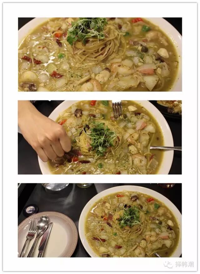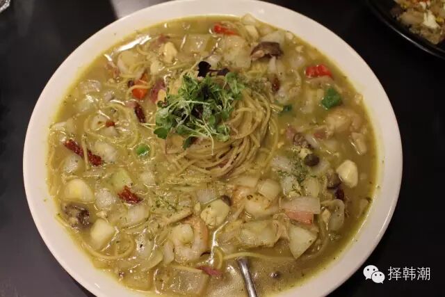 这是店长推荐的,她说这个是她觉得本店最好吃的意大利面呢,浓厚的罗勒香蒜酱的风味和橄榄相搭配,再加上丰厚的菜与虾的完美结合,才能出来这么美味的菜系吧~~然而更让我吃惊的是量!!四个人吃都绰绰有余~~赞!!