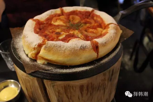 真的非常厚,真不愧是芝加哥披萨。CONTRY MAN`S特制的高级马苏里拉奶酪以及新鲜番茄酱和生番茄烹制的,味道真的非常特别,这么厚的披萨我还是第一次尝到呢,不错!!(终于知道这个木头桩子干什么的了)