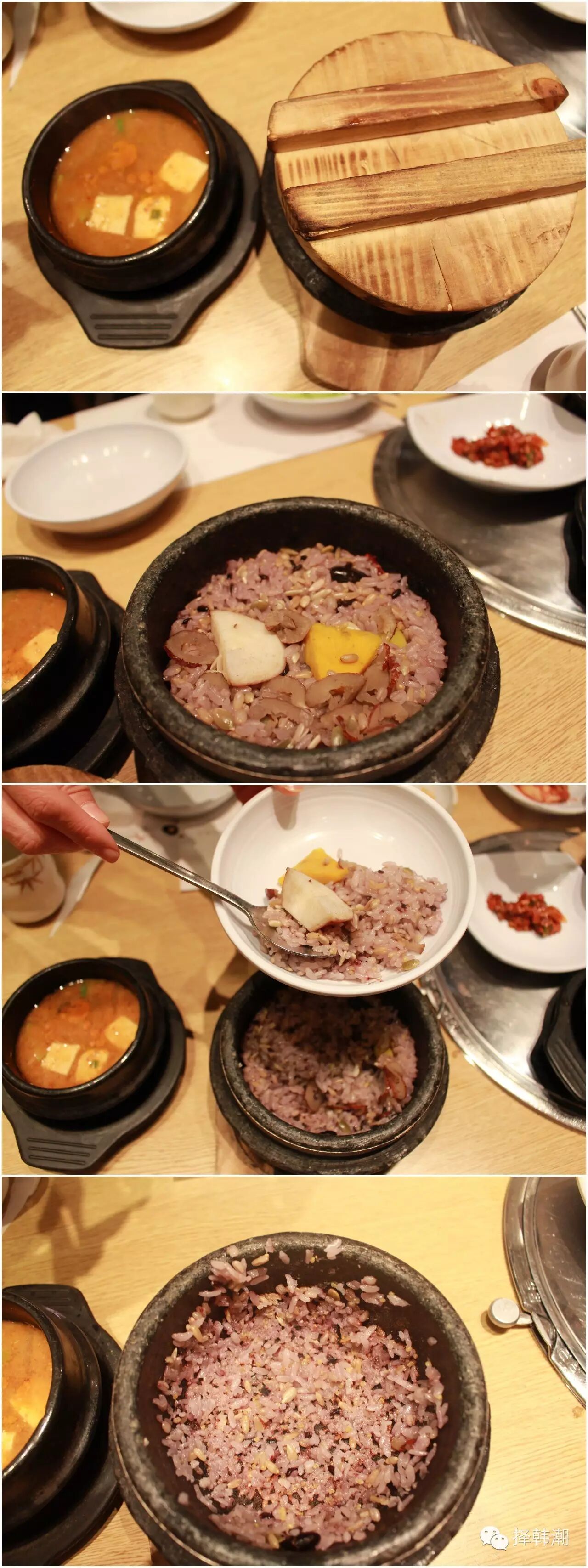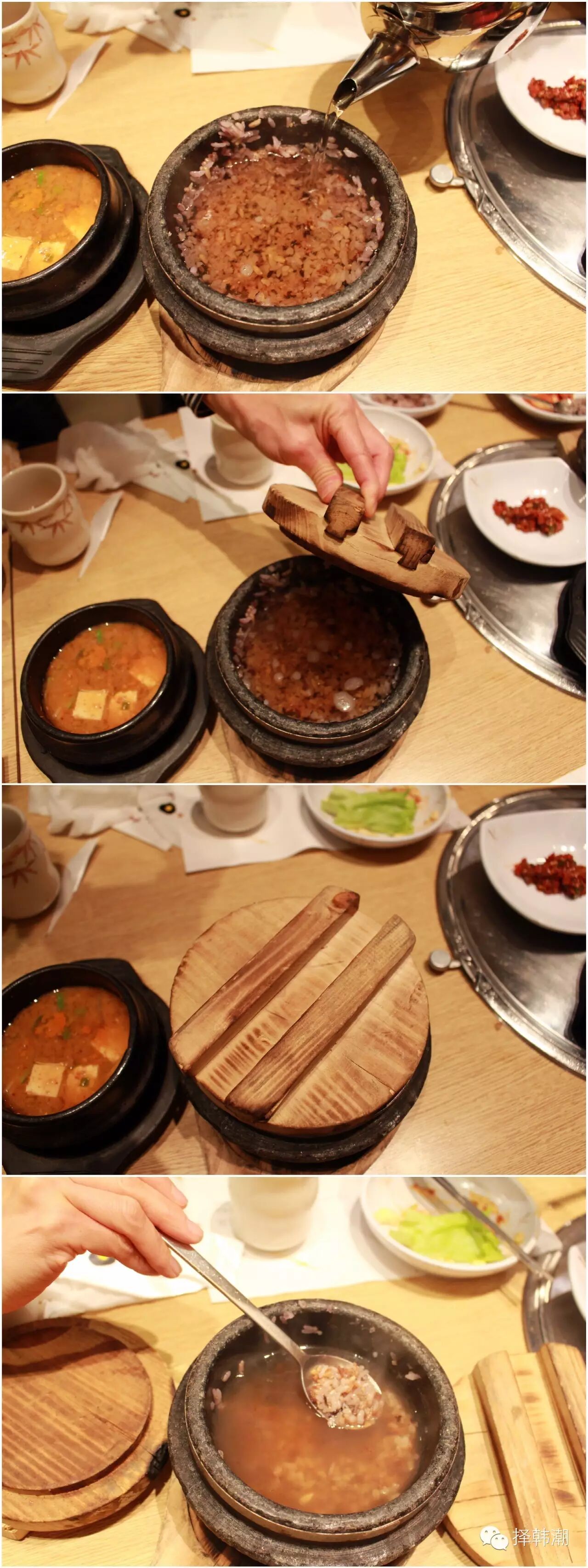 揭秘石锅饭的吃法,首先把盖子打开,然后把饭盛出来,就这么简单