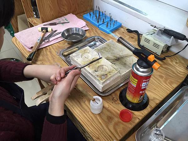 老師利用瓦斯槍 然後還有小小的銀片 慢慢的把兩旁接在一起